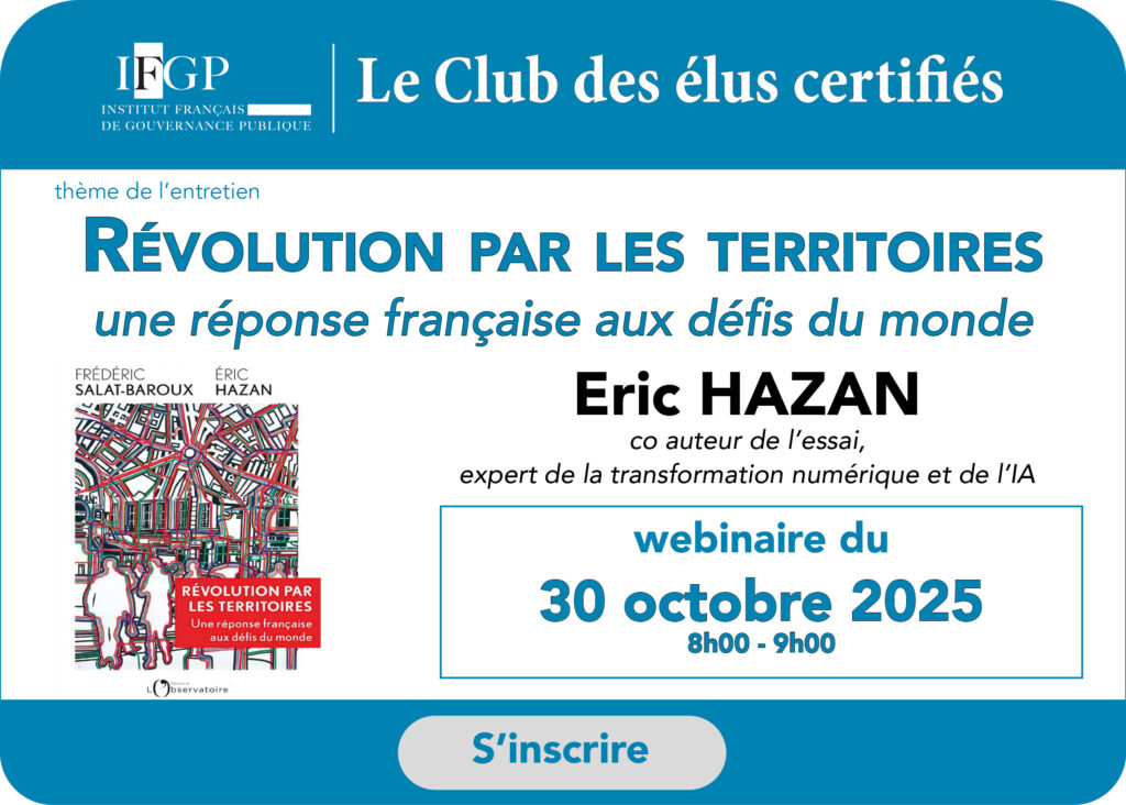 Dans le cadre du développement de la Communauté Apprenante des élus, l’IFGP propose aux élus de se retrouver pour des temps d’échange autour des enjeux de la gouvernance publique.Deux modalités complémentaires sont proposées : soit en direct autour d’une personnalité référente sur une thématique relevant de la gouvernance publique soit en postcast autour d’interviews de témoignages d’élus, de professionnels et d’experts de l’action publique. Ce dispositif est ouvert gratuitement aux élus, et en particulier aux élus certifiés en gouvernance publique. 1) Les Entretiens de la Gouvernance : Rendez-Vous en webinaire S’entretenir en direct entre élus autour d’une personnalité invitée sur les thématiques de la gouvernance publique et de l’action publique locale.Ces rendez-vous sont ouverts aux élus sur inscription préalable. PROCHAIN WEBINAIRE » L’apport de l’IA dans l’action publique »jeudi 18 septembre 2025 – 8h00-9h00Monsieur Olivier GACQUERREMaire de Béthuneet président de la Communauté d’agglomération de Béthune-Bruay, Artois Lys Romane S’inscrire au prochain webinaire Les rendez-vous webinaires 2024/2025 9 avril 2024Nous remercions madame la Sénatrice Françoise Gatel, présidente de la délégation aux Collectivités territoriales du Sénat, pour sa participation à ce premier webinaire de l’IFGP. Chacun des élus présents a pu échanger librement avec elle sur les propositions que le Sénat vient d’adopter à l’unanimité sur l’évolution des conditions d’exercice d’un mandat. consulter les propositions du Sénat 16 avril 2024Nous remercions madame Catherine Trautmann, ancienne ministre et maire de Strasbourg, pour le partage de son analyse sur les évolutions qualitative du processus de décision publique grâce à l’association des citoyens, et ce faisant au renforcement de la démocratie en France. (bientôt en postcast) consulter l’intervention de madame Trautmann 4 juin 2024Grands remerciements à monsieur Dominique Bussereau, ancien ministre des Transports et président de l’Assemblée des Départements de France, pour sa présentation de l’état des mobilités en France tous modes – (bientôt en postcast) consulter l’intervention de monsieur Bussereau 8 juillet 2024Nous remercions monsieur Daniel Keller, Haut Fonctionnaire, pour la qualité de son intervention qui a permis aux élus locaux d’avoir un échange approfondi sur les enjeux de la réforme de la Haute Fonction Publique à l’aune de la relation avec les collectivités territoriales. consulter l’intervention de monsieur Keller 24 septembre 2024Nous remercions madame Marylise Lebranchu, ancienne ministre et élue locale pour son témoignage et le partage de son expérience. Les élus locaux ont pu apprécier les encouragements ainsi prodigués à ne jamais oublier leur fonction dans la relation avec les administrations d’Etat. consulter l’intervention de madame Lebranchu 29 octobre 2024Vous pouvez retrouver en replay l’intervention de monsieur Pascal Perrineau, que nous nous remercions pour ce temps consacré à discuter avec des élus locaux sur la crise de la démocratie en France. Voir en replay l’intervention de monsieur Perrineau 6 mars 2025, en partenariat avec ServirNous remercions monsieur Bruno Rémond, pour avoir partagé son analyse sur les raisons expliquant la situation d’un Etat en France si peu décentralisé : un regard à la fois historique des relations entre l’Etat et les Collectivités et pertinent sur la décentralisation. Poser une question à M. Bruno Rémond 10 avril 2025Nous remercions madame Hélène Guillet, présidente du SNDGCT, pour son aimable intervention sur le thème : « le rôle des cadres administratifs dirigeants auprès des élus locaux ». Poser une question à Mme Hélène Guillet 22 mai 2025Nous remercions monsieur Erwan Cloarec, pour son éclairage sur le thème : « les élus locaux et la laïcité ». Ce webinaire a permis de rappeler utilement les fondamentaux sur les principes de la laïcité en regard de l’action publique. Poser une question à M. Erwan Cloarec 3 juillet 2025Nous remercions monsieur Claude Belot, pour le partage de regard sur le long terme de l’intérêt d’agir en intercommunalité. Ce webinaire fut un moment de grande qualité d’échange d’expérience avec d’autres élus locaux. Poser une question à M. Claude Bélot Le calendrier des prochains rendez-vous webinaires 2025 Jeudi 18 septembre 2025 : « L’apport de l’IA dans l’action publique » avec M. Olivier Gacquerre Jeudi 25 septembre 2025 : « La stratégie de développement des infrastructures de transport » avec M. Dominique Bussereau, président de la conférence Ambition France Transports Jeudi 6 novembre 2025 : « Une nouvelle organisation de l’Etat pour une meilleure performance de l’Action Publique » avec M. Eric Hazan Jeudi 11 décembre 2025 : « Les élus locaux et la gestion de l’Eau » avec Mme Estelle Grelier, présidente de la Saur S’inscrire au prochain webinaire 2) Les Entretiens de la Gouvernance : interviews en postcat Retrouvez dès maintenant la première série d’interviews sur la Web TV IFGP :postcast en libre accès les Entretiens de la Gouvernance https://www.youtube.com/watch?v=-TKKrRu-4nM&list=PL6vraRDR99m0c6O0bWFl2lwvuCcr3xfW1&index=1&pp=iAQB